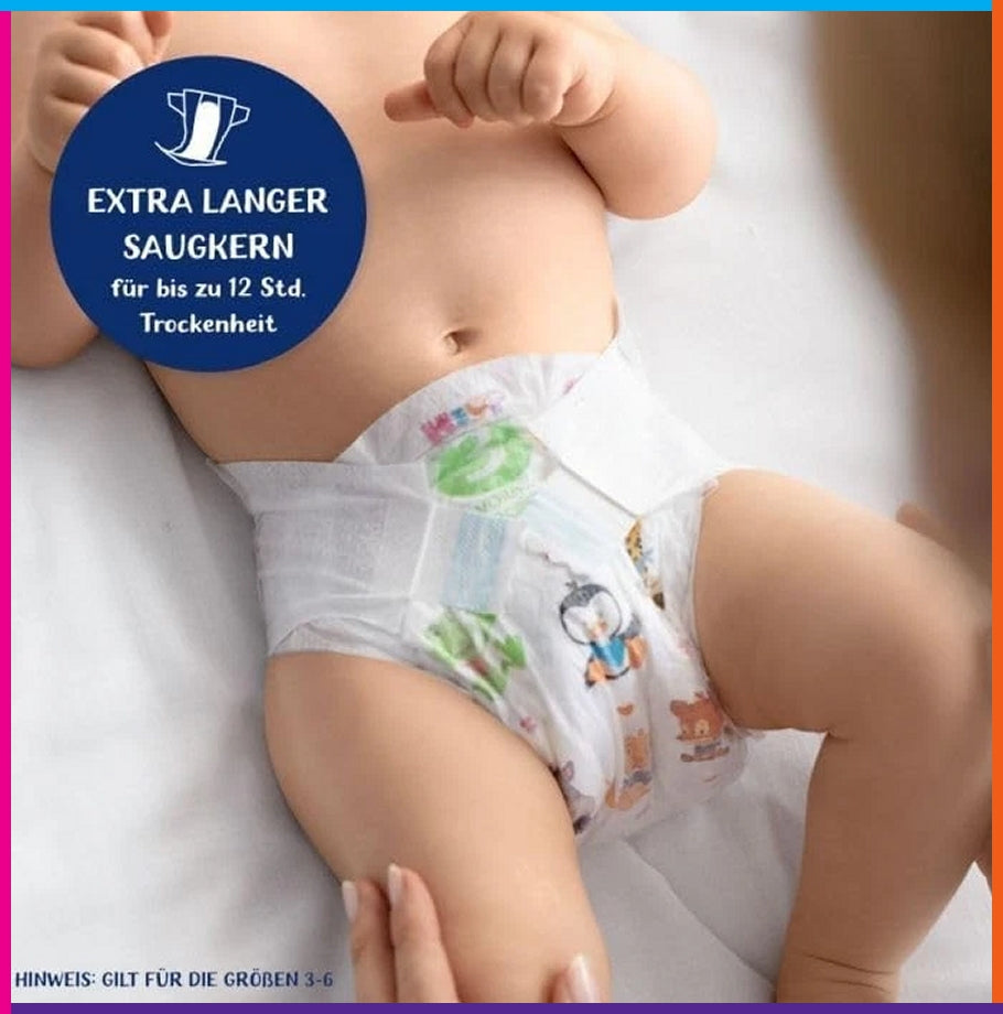 Jetzt neu mit Tag und Nacht dreifach Auslaufschutz für noch mehr Sicherheit. Der optimierte Saugkern schließt die Flüssigkeit zuverlässig ein und hält diese von Babys Haut fern, Für ein Wohlgefühl Tag und Nacht.